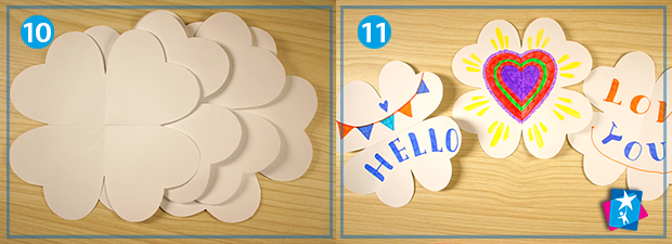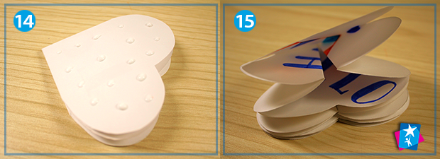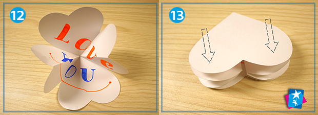 Далі треба правильно скласти елементи. Дивіться на фото 12: зверху і знизу лишаються рівні сердечка, справа і зліва вони згинаються досередини. Закрита сторінка з одного елементу зображена на малюнку 13. Повторіть те ж саме з іншими сторінками. Накладіть складені елементи один на одного, склейте між собою.