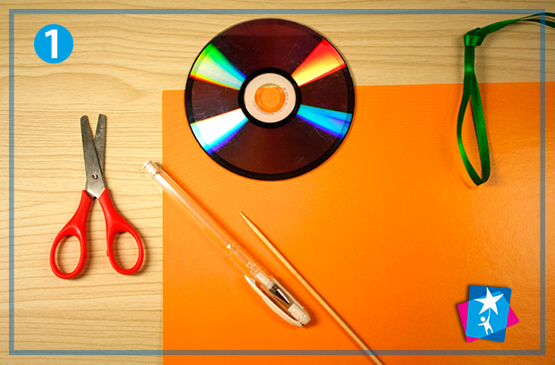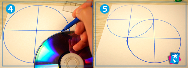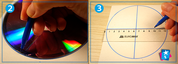 Візьміть картонний аркуш, перегорніть кольором вниз. Обведіть диск фломастером, позначте крапкою цент кола. Через центр проведіть дві лінії симетрії — горизонтальну та вертикальну.