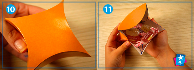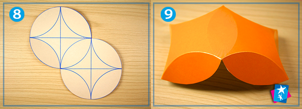 Вирізаємо подвійне коло по контуру, як на малюнку 8. По дугоподібних лініях згину моделюємо форму коробочки. Поміщуємо туди солодощі. Закриваємо основу бонбоньєрки кришечкою і перев'язуємо стрічкою, формуємо бант. Якщо у вас немає стрічки, можете просто склеїти краї коробочки зсередини.