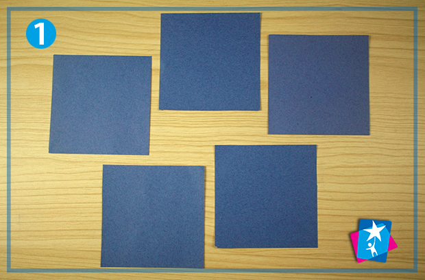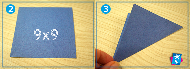 Беремо аркуш кольорового паперу А4 або квадратний записничок зі стікерами. Нам знадобиться 5 кольорових квадратиків 9х9 см. Складаємо перший квадрат по діагоналі. У нас вийде рівнобедрений трикутник, який ми вкладаємо на основу.