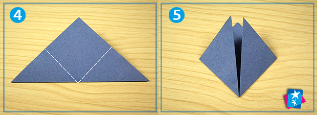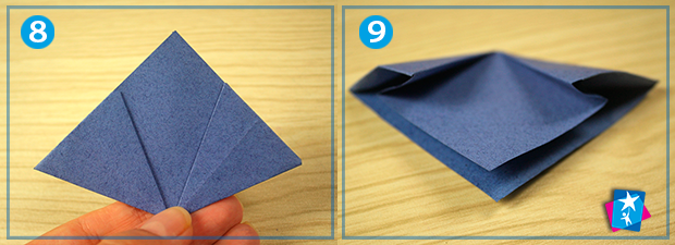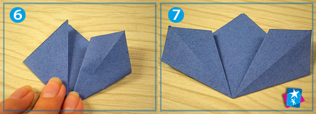 Бокові кути загортаємо до верхнього, третього кута. Притискаємо лінії згину (фото 5). Верхній шар потрібно розгорнути і скласти, направляючи грані за допомогою пальців в протилежному напрямку (див. фото 6 та 7).