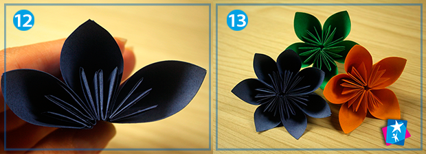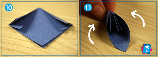 Тепер по видимих лініях згину справа і зліва ще раз загорніть бокові трикутнички нагору (фото 10). Візьміть пальцями за краї та скрутіть у пелюстку, склейте у такому положенні (фото 14). Створіть таких елементів від п’яти до семи, почергово поєднайте між собою клеєм.