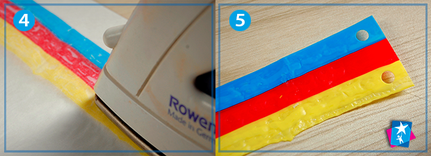Під дією високої температури пластик розплавиться, розмежовані раніше кольори поєднаються. Зніміть папір та почекайте, поки браслет охолоне. Відріжте непотрібні частини, зрівняйте ножицями краї прикраси.