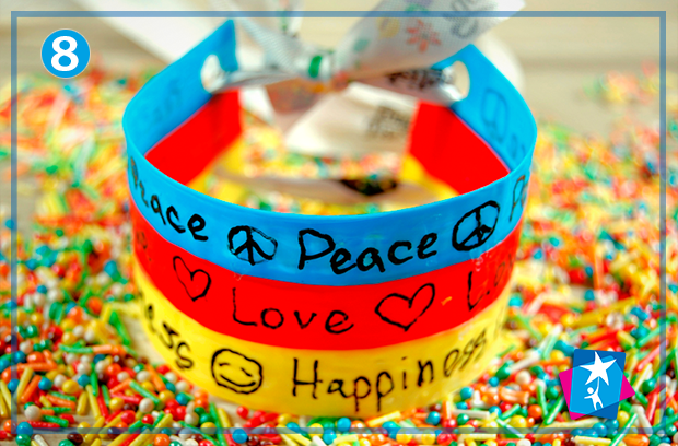 Пробийте по два отвори діроколом з кожного короткого боку пластикової стрічки. Розмалюйте тонким перманентним маркером кожну смужку, що ви отримали, або можете залишити браслет без написів і малюнків.