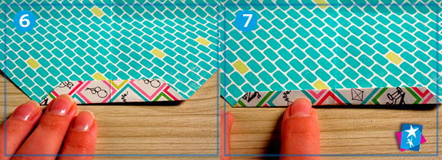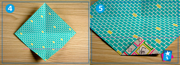 Складіть квадрат по діагоналях і розправте. Кожну лінію згину добре прогладжуйте лінійкою. Підігнуть один кут квадрату до центру фігури та розправте (лінія згину показана рожевим пунктиром). До нової лінії згину підігніть той же кутик (див. фото 5).