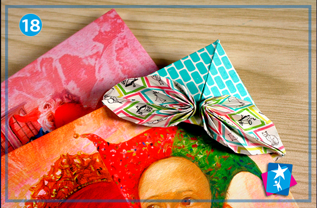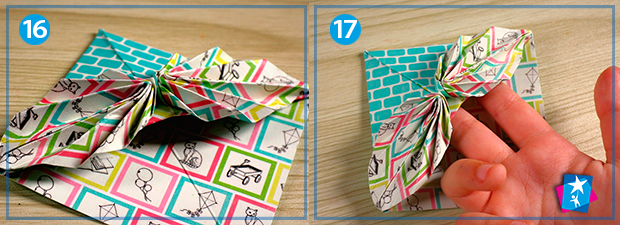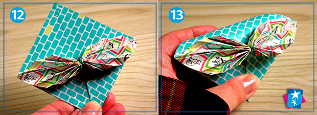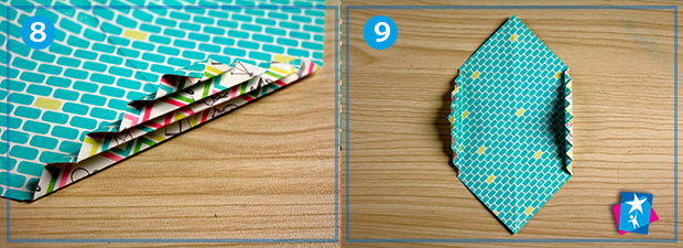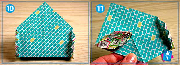 Таку ж гармошку робимо з іншого боку фігури, симетрично (див. мал. 9). Далі треба згорнути нашу фігуру по горизонтальній осі у вигляді будиночку, щоб гармошка при цьому опинилася зовні. А далі нижні кути основи будиночка треба підгорнути до центральної вертикальної осі, але при цьому вивернути частини бантика на лицьову сторону (фото 11 —12).