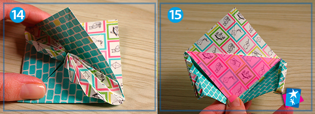 А далі все просто: верхню частину фігури загинаємо назад, верхній і нижній кути ромба сходяться, при цьому утворюється нова лінія згину (фото 13). Далі знов вертаємо кут ромба нагору і розділяємо цю частину фігури на два шари. Верхній шар ховається в середину фігури при розгортанні кутиків з бантиками (дивіться виділений рожевим кольором трикутник на фото 15).