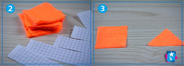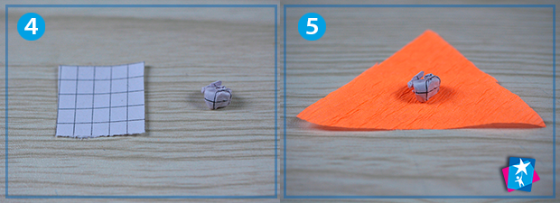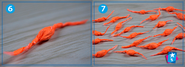 З квадратного шматочка гофропаперу утворіть кілька трикутників. В кожен трикутничок вкладіть кульку та загорніть, як цукерочку. Кінці скручуйте обережно, щоб не порвати, — мають вийти довгі "вусики".