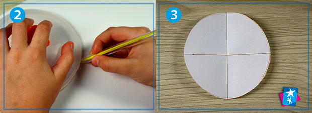 1. Створюємо шаблон. Малюємо коло на білому аркуші. Дітям зручно обводити якийсь невеликий круглий предмет, наприклад, кришечку з дитячого посуду або невеличку миску. Вирізаємо коло і складаємо пополам, далі розгортаємо і наводимо лінію згину ручкою. Ще раз складаємо коло і отримуємо другу лінію, перпендикулярну до першої (див. фото 3). А ще таким чином ми отримаємо центр фігури.