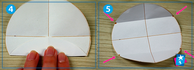 Вкладаємо коло, щоб одна з ліній опинилася у горизонтальній позиції. Підтягуємо до центру нижній край, розгортаємо. Потім те саме робимо з верхнім краєм. Кінці нових ліній згину (ті, що на контурі кола) треба позначити точками (на них вказують стрілки на малюнку 5).