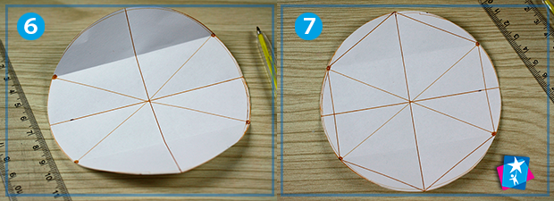 Кінці протилежних точок з’єднуємо лініями, як на фото 6. Далі прокреслюємо контур шестикутника, як на мал. 7, вирізаємо фігуру.
