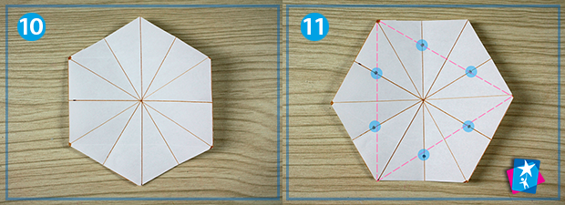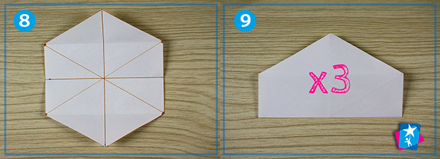 Якщо вкласти шестикутник на кут, як на фото 8, то залишається зігнути його симетрично посередині. Вийде щось схоже на будиночок (мал. 9), а ми отримаємо нову лінію згину. Всього таких ліній буде три, вони поєднують середини протилежних сторін шестикутника.