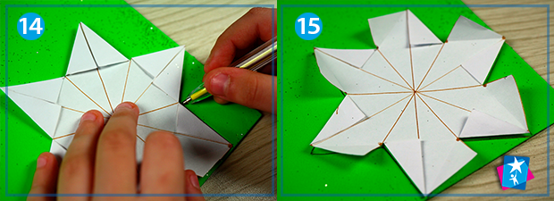 Далі треба взяти ножиці і зробити надрізи: від середини кожної сторони шестикутника до наших новостворених точок (див. фото 12). Створіть кутики зірки, для цього просто поскладайте папір від надрізів вправо та вліво до намальованих ліній (мал. 13). Наш шаблон готовий!