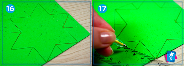 2. Переносимо шаблон. Переносимо контури зірки на зворотну сторону фоамірану. Спочатку прокреслюємо закриту зірку, потім відкриваємо всі праві кутики та проводимо лінії, а далі прибираємо шаблон. Результат, який ми бачимо на мал. 16, доповнюємо ручкою та лінійкою, просто з’єднуючи кути між собою.