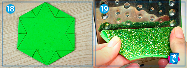 3. Формуємо зірку. Почнемо з блискучої сторони виробу. Згинаємо основу по довгій стороні, торкаємось на кілька секунд до розігрітої праски (фото 19). Нагрітий фоаміран дуже податливий, тому ми цю лінію фіксуємо пальцями: легко стискаємо по всій довжині. Таких довгих випуклих ліній у нас має бути 3, подивіться, як вони виглядають, на фото 20.