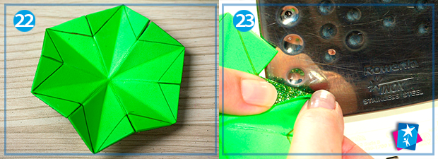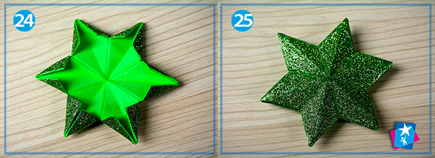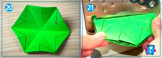 В іншому напрямку ми будемо вигинати короткі лінії (це ті, що поєднують середини сторін шестикутника). Для цього прикладаємо до праски складену тильну сторону шестикутника (фото 21). Оскільки ліній три, то і процедуру повторюємо тричі. Результат — на малюнку 22. Надрізи треба розкрити, маленькі кутики загорнути всередину зірки. З цим також допоможе праска, буквально по кілька секунд на фіксацію кожного згину (фото 23). Як виглядатиме половина виробу з обох боків, подивіться на малюнках 24 — 25.