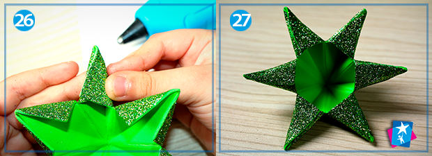 Передостанній етап — формування гострих кінців зірки. Накладайте кутики один на одного, між ними видавіть краплю термоклею та потримайте. Дві половинки зірочки склейте між собою за кінчики по черзі, не забудьте вкласти ниточку або стрічку для підвішування. Для привабливого зовнішнього вигляду рекомендуємо закрити шов, який видно після склеювання частин.