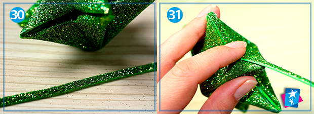 Відріжте кілька смужок блискучого фоамірану шириною 3 мм та приклейте зверху на боковий шов. Процес показаний на фото 30 — 31. Кінчики пропрацюйте на розігрітій поверхні праски: трохи попритискайте та згладьте кути.