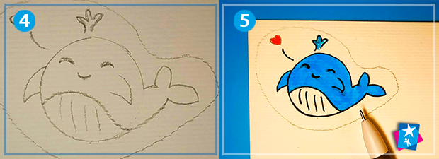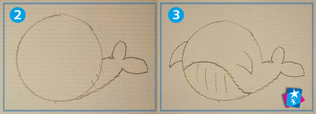 Зараз навчимося за 4 етапи малювати китеня. Спершу накреслимо на білій картонці коло від руки або за допомогою монетки. Домалюємо збоку хвіст, а знизу виділимо животик. Зітремо губкою зайві лінії, щоб отримати суцільне тіло. Залишилися милі деталі: очі, ротик, плавники, фонтанчик, сердечко.