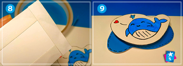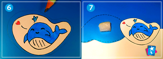А далі приклеюємо на синю основу по центру квадратик спіненого скотчу. Можна навіть накласти пару квадратиків один на одного, щоб вище підняти картинку над заднім планом. На клейкий спінений скотч клеїмо до фону нашого кита.