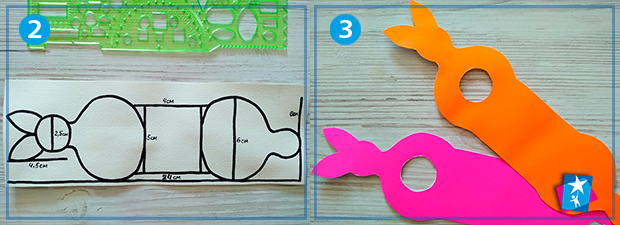 Прикладаємо трафарет до звороту кольорового картону, обводимо, вирізаємо по контуру. На місці животика прорізуємо круглий отвір, цей процес зручно робити макетним ножем. А далі все просто: загинаємо коробочку по лініях згину, щоб прямокутник став основою, тобто дном. Вкладаємо смаколик, закриваємо коробочку стрічкою або шнуром в області шиї — просто зав'язуємо бантик. Також можна грайливо загнути вушко зайченяті.