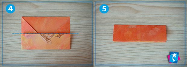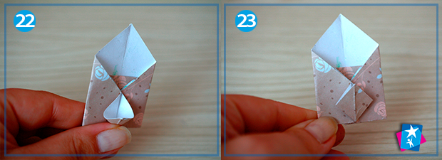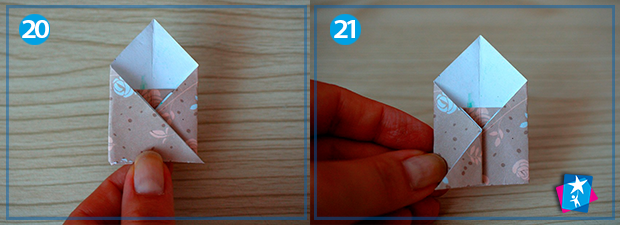 Фото 21—22—23—24. Залишається одна невеличка деталь — застібка. Для її створення ми відгинаємо кутик у верхньому шарі справа наліво, пригладжуємо лінію згину. Розкриваємо шари цього кутика пальцем, притискаємо його нижню частину до верхньої. Вийде міні-ромб, у який ми опускаємо верхній елемент конверта.