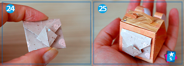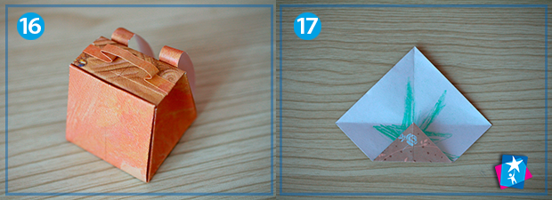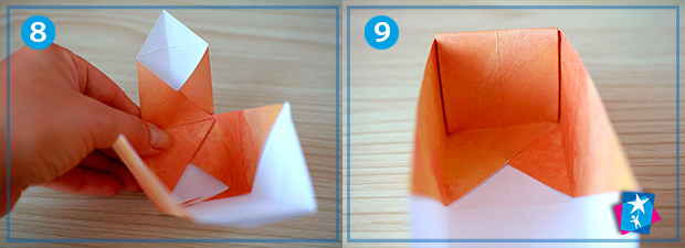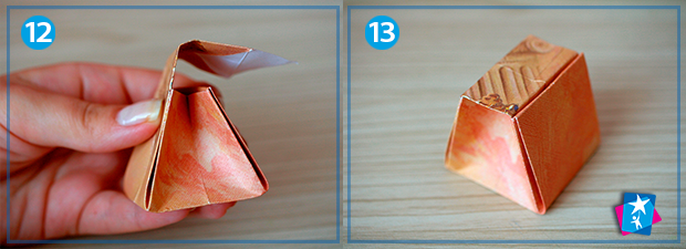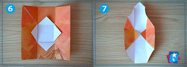 Фото 6—7—8—9. На вертикальні однакові ділянки зменшений квадрат також треба поділити і зігнути. На мал. 6 ми бачимо фігуру після розгортання. З неї будемо формувати грані коробочки: дно по центру, зверху розправимо кутик, а бокові сторони накладемо одна на одну. І прикриємо верхнім кутиком дно коробки.