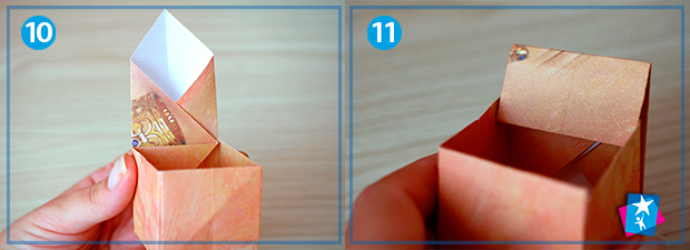 Фото 10—11—12—13. Тепер попрацюємо з протилежною стороною. Спершу кутик дивитиметься вгору, а потім ми вкладемо його по лінії згину, зігнемо цю грань по горизонталі і потягнемо ще трохи нижче, у коробочку, фіксуючи нову лінію згину. Тепер ми маємо податливу верхню частину портфельчика, яку з легкістю заправимо досередини нашого виробу. Паралельно працюємо з боковинками, надаючи пальцями округлої форми.