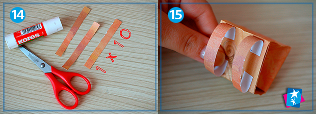 Фото 14—15—16. Тепер приступаємо до лямочок і ручки. Вирізаємо три паперові смужки 10х1 см. Дві з них підклеюємо зі сторони спинки рюкзака. Третю згинаємо по горизонталі і приклеюємо замість ручки.