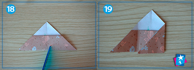 Фото 17—18—19—20. Починаємо робити кишеньку. Квадрат 10х10 см повертаємо ромбом. За допомогою діагоналей визначаємо центр. Підтягуємо до центру нижній кут. Згинаємо ще раз угору по серединній лінії. Ділимо основу трикутника на три рівні частини, накладаємо праву боковинку, потім ліву. Отримуємо невеличкий конвертик.