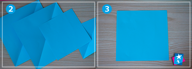 Фото 2—3. Виріжте з офісного або кольорового паперу чотири квадрати (взагалі для однієї квітки можна взяти будь-яку кількість квадратиків, але не менше двох). Для великої квітки у проекті використані аркуші 21х21 см (2 шт.), 16х16 см та 10х10 см. Чим більший квадрат, тим простіше з ним працювати на етапі вирізання, враховуйте цей момент відповідно до віку дитини.