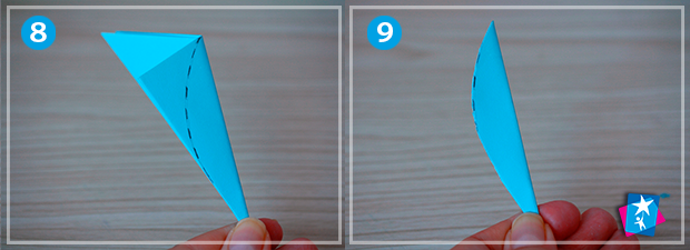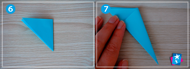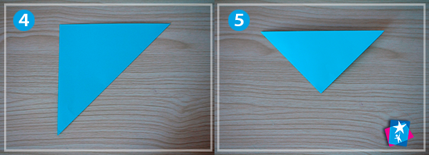 Фото 4—5—6—7. Покладіть квадрат перед собою. Складіть по одній діагоналі. Отриманий трикутник складіть по висоті. І ще одну лінію згину сформуйте по висоті нового трикутничка. А тепер один з кутів підтягніть до протилежної сторони.