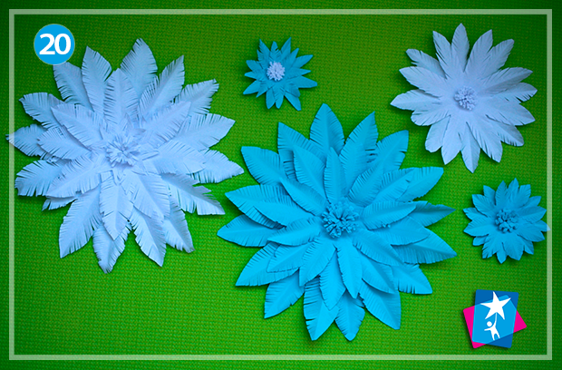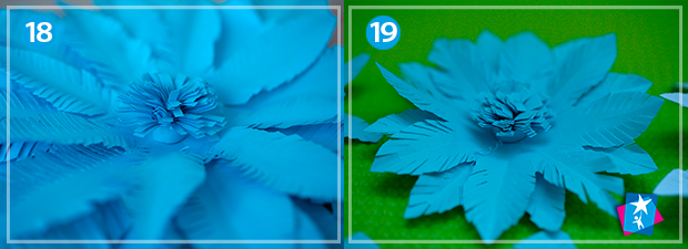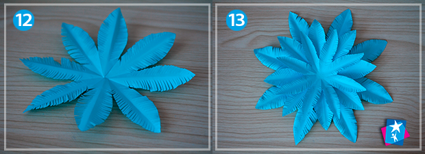 Фото 12—13. Розгорніть пелюстки і помилуйтеся, який гарний шар для майбутньої квітки ви зробили. Виріжте кілька таких шарів і приклейте їх центри один на одного.