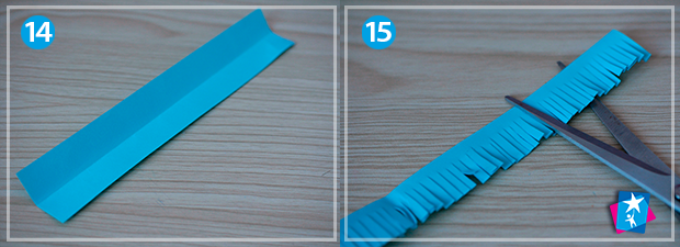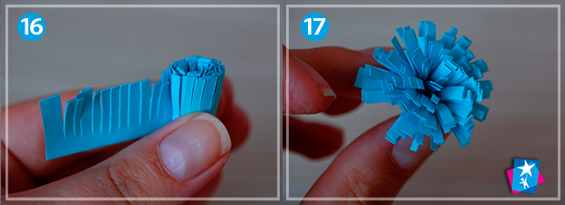 Фото 14—15—16—17. Візьміть довгу смужку паперу, у висоту приблизно 2 см. Складіть по горизонталі. В два шари наріжте ножицями бахрому. Закрутіть пальцями у рол, приклейте кінець та розпушіть верхню частину.