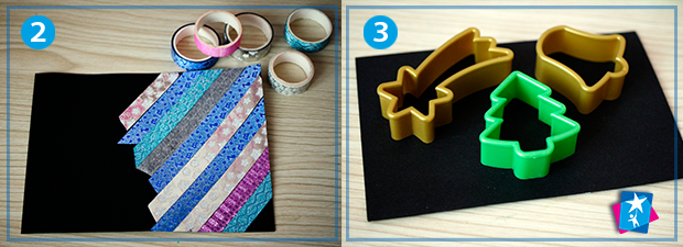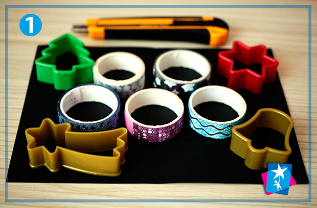 Спробуємо вирізати фігурні віконечка, крізь які проглядатимуть яскраві стрічки кольорового скотчу