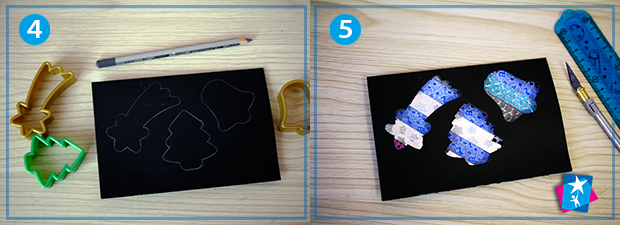 Закриваємо листівку і до титульної сторінки прикладаємо форми для печива. Обводимо олівцем зірочку, ялинку, дзвіночок. Вирізаємо макетним ножем по контуру фігурок віконця. Важливо обирати прості форми або допомагати дитині на цьому етапі.