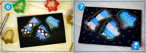 Насправді, таку листівку можна робити на будь-яку тему. Ми приурочили цей виріб до зимових свят. Обрали контур ялинки, зірки й дзвіночка (зручно користуватися формочками для печива, а можна й від руки). Обвели фігурки і прорізали макетним ножем віконця. Що робити далі, як отримати ефект багатошаровості, дивіться на фото.