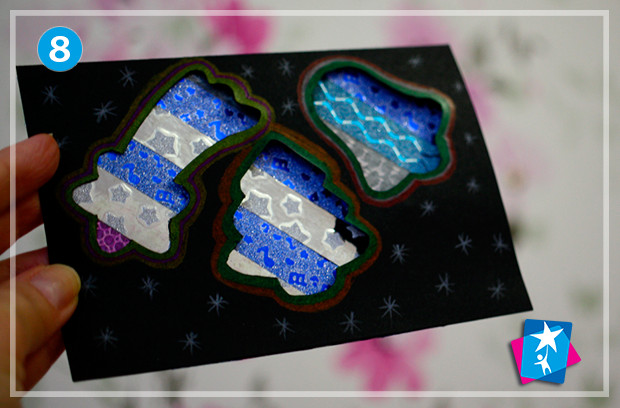 Коли ми закінчуємо вирізати, стає видно, як крізь перший темний шар листівки проглядають чудові яскраві, блискучі стрічки зсередини. Дітям подобається такий незвичний ефект. На додачу можна доповнити титульну сторінку намальованими світлими сніжинками, конфеті, серпантином тощо.