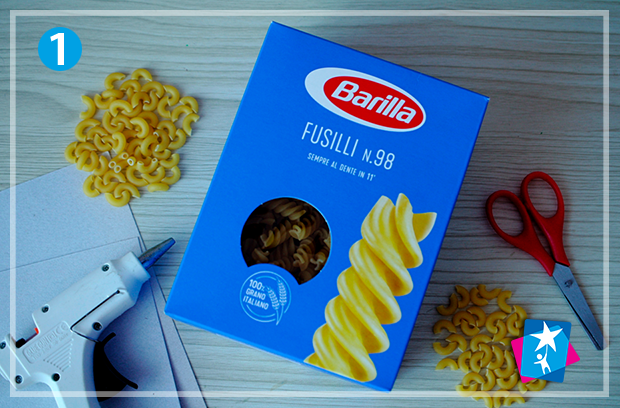 Нам знадобляться макарони-спіральки і якісь невеличкі фігурні вироби. А ще — картон, клей та фарби. З таким простим набором матеріалів отримаємо гарний досвід: попрацюємо з дрібними предметами для вдосконалення моторики, створимо новорічні декорації, прикрасимо домашній куточок.