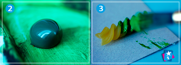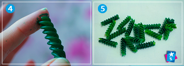 Пофарбуйте зеленим акрилом спіральні макарони. Інші макаронні вироби зробіть яскравими та контрастними за допомогою червоного, блакитного, жовтого кольору тощо.