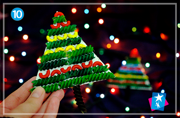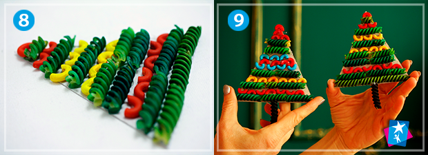 Наріжте міцний картон (можна зі старої коробки) на трикутники. Ширину основи розраховуйте, щоб помістилося три спіральних макаронини. Всі кольорові елементи, які вже висохли, слід посадити на основу на клей. Має вийти зелена ялинка з яскравими іграшками.