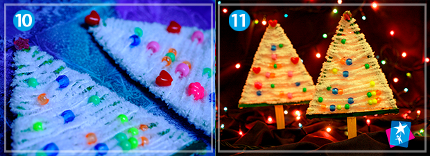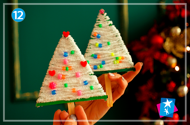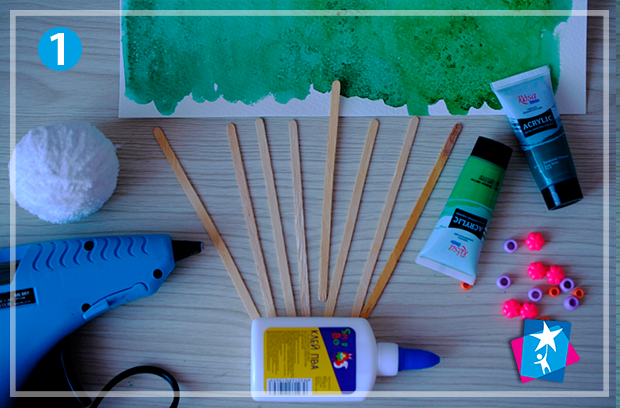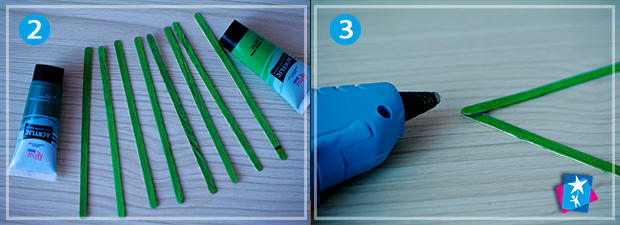 Одна ялинка складається з трьох дерев'яних паличок. Їх можна замінити міцними картонними смужками. Склейте пару паличок, пофарбованих у зелений колір, під кутом.