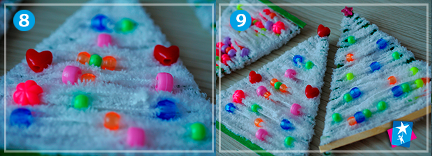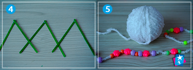 Нанижіть на пухнасту нитку бусинки. Закріпіть кінець нитки на вершині, поступово намотуйте на праву і ліву паличку, поступово спускаючись до низу. В кінці приклейте дерев'яну перемичку, а потім доповніть конструкцію стовбуром.