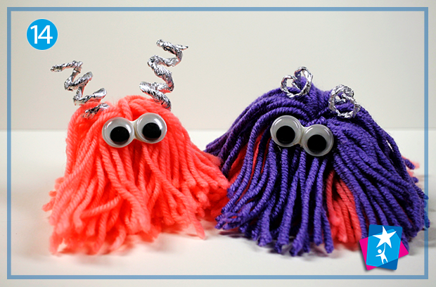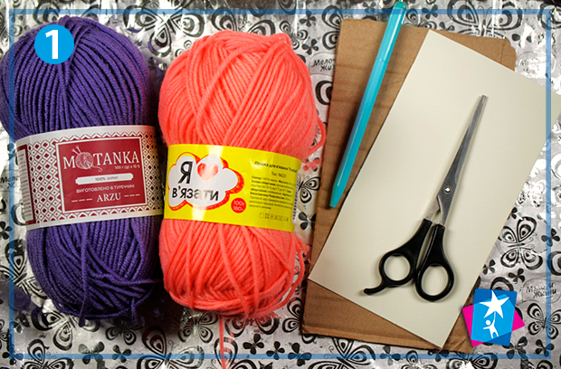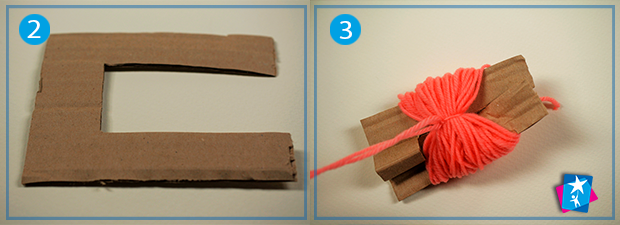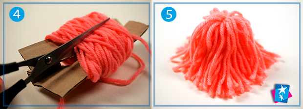 Виріжте зі старої коробки прямокутник з отвором у вигляді літери «П». Намотайте пряжу на цю картонну заготовку. Коли отримаєте пружний моток, зв’яжіть одну сторону ниткою, а протилежну сторону розріжте ножицями (див. фото 3—4). Причешіть свого малюка-монстра пальцями.