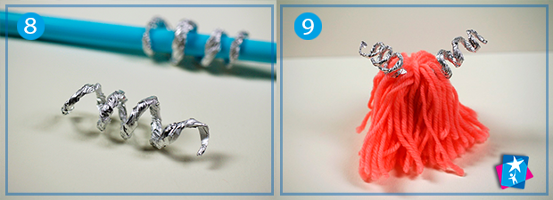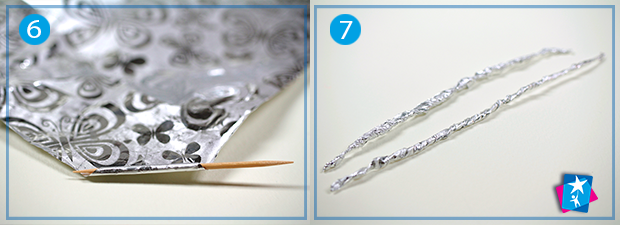 Переходьте до створення ріжок. Для цього накрутіть на зубочистку або тонку дерев'яну шпажку фольгу. Зубочистка потрібна лише на початку процесу, потім її слід забрати. Отримані довгі відрізки туго скрученої фольги намотайте спіралькою на ручку чи олівець. Отримаєте симпатичні закручені ріжки.