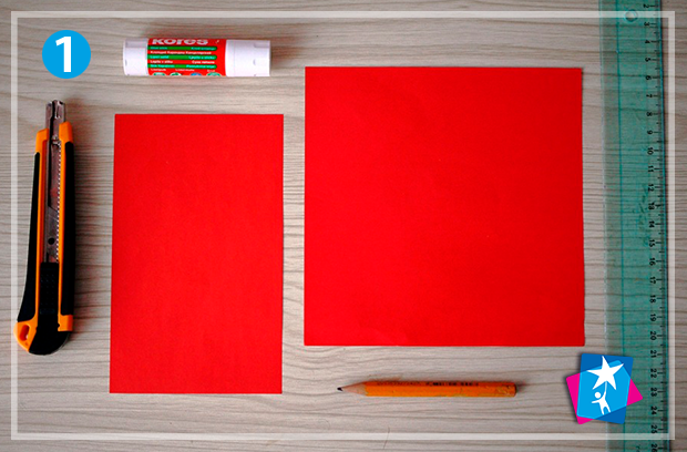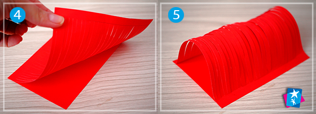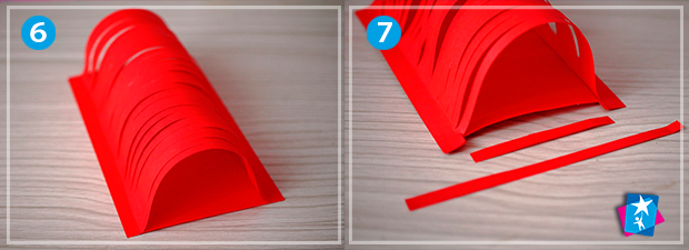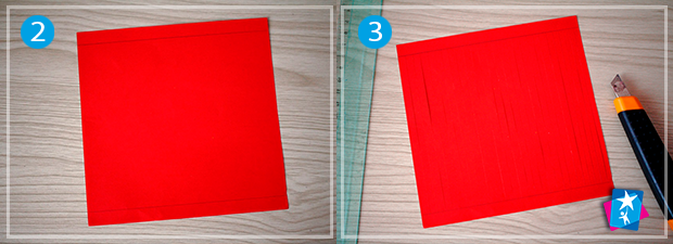 Виріжте з червоного паперу квадрат 15х15 см і прямокутник 10х15 см. На квадратному аркуші прокресліть зверху і знизу по смужці шириною 1 см. Ці смужки треба залишити без змін, а все поле аркуша, що залишилось, будемо нарізати тонкими вертикальними надрізами. Для цього візьміть канцелярський ніж і під лінійку, від краю до краю, наріжте папір на тонкі вертикальні полоси по кілька міліметрів (приблизно 4—5 мм). Пам'ятайте, що ці полоси повинні триматися за верхнє і нижнє поле, яке ми відміряли раніше.