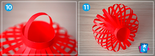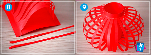 Далі залишилося найпростіше — скрутити основу у коло і приклеїти виступаючі частини поверх рівного краю. Хвильки мають красиво виступити вперед та сформувати контури округлого ліхтарика. Якщо треба, підправте пальцями форму зсередини: працювати з тонким податливим папером надзвичайно приємно. В кінці роботи треба підклеїти паперову ручку до ліхтарика, якщо плануєте підвішувати декорацію або створювати цілий набір елементів гірлянди.