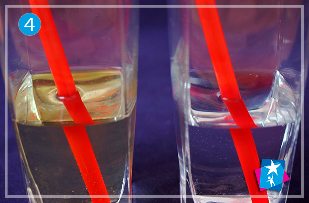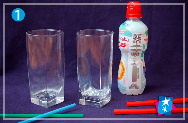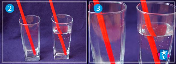 Одну склянку залиште порожньою, а в іншу налийте води. Опустіть у склянки трубочки. Як бачимо, у склянці з водою трубочка здається трохи ширшою, а також спрацював ефект заломлення світла і ми спостерігаємо викривлення об’єкту на межі двох середовищ.