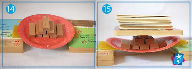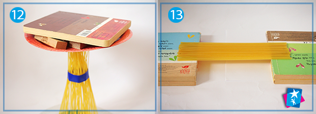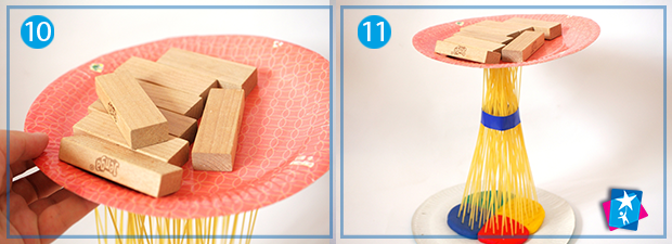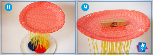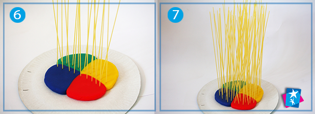 Вставимо у пластилін всі макаронини по черзі, вертикально. Бажано рівномірно. Отримаємо набір стержнів, які будемо навантажувати. Спершу виставимо зверху тарілку — можна притримувати її, якщо опора надто хитається. На тарілку по черзі викладаємо брусочки з дерева або кубики.