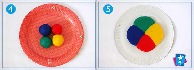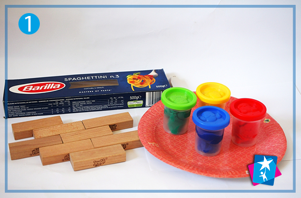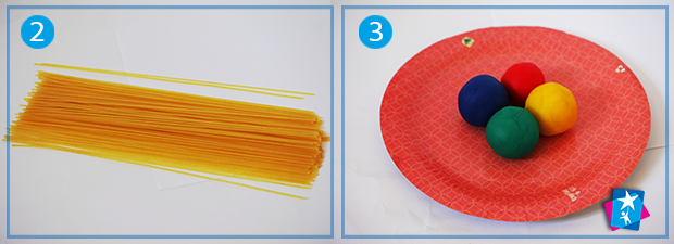 Дістанемо частину спагеті з коробки. Підготуємо фундамент для опори. Пластилін викладемо на тарілку і придавимо чимось, щоб куля стала рівномірною (але не пласкою).